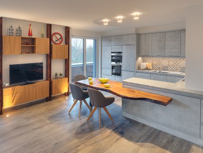 In der Küche spielt sich das Leben ab: Hier wird gearbeitet, gelacht, diskutiert – und gegessen. Kochen und Essen in einem Raum oder bei Bedarf optisch ansprechend voneinander getrennt zeichnen unser modernes Küchen-Holzdesign aus. Unsere Schreinerei fertigt Wohnküchen für Menschen, denen Kochen und gutes Essen viel bedeuten.